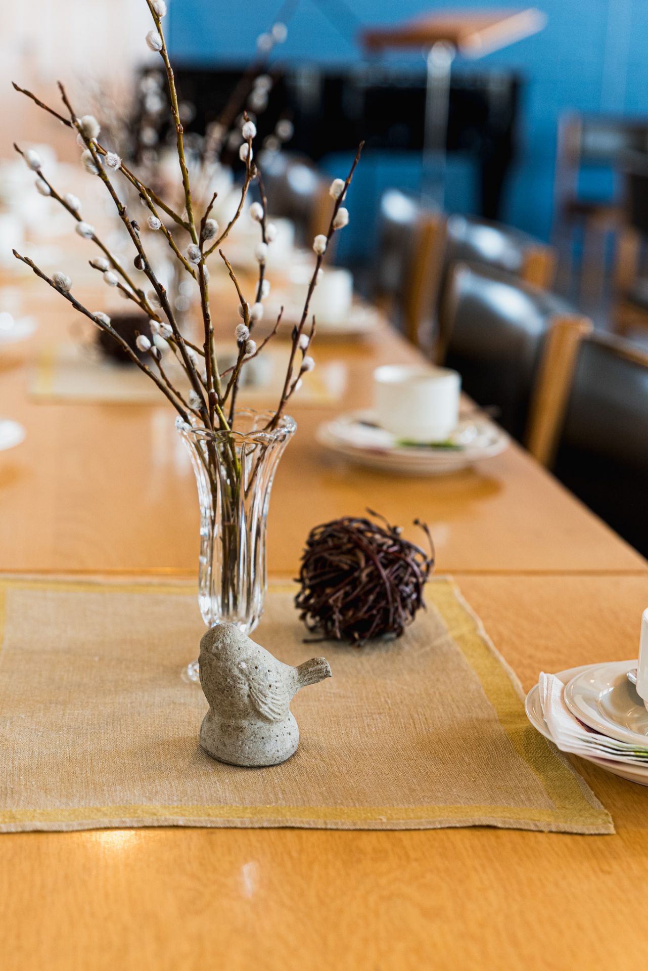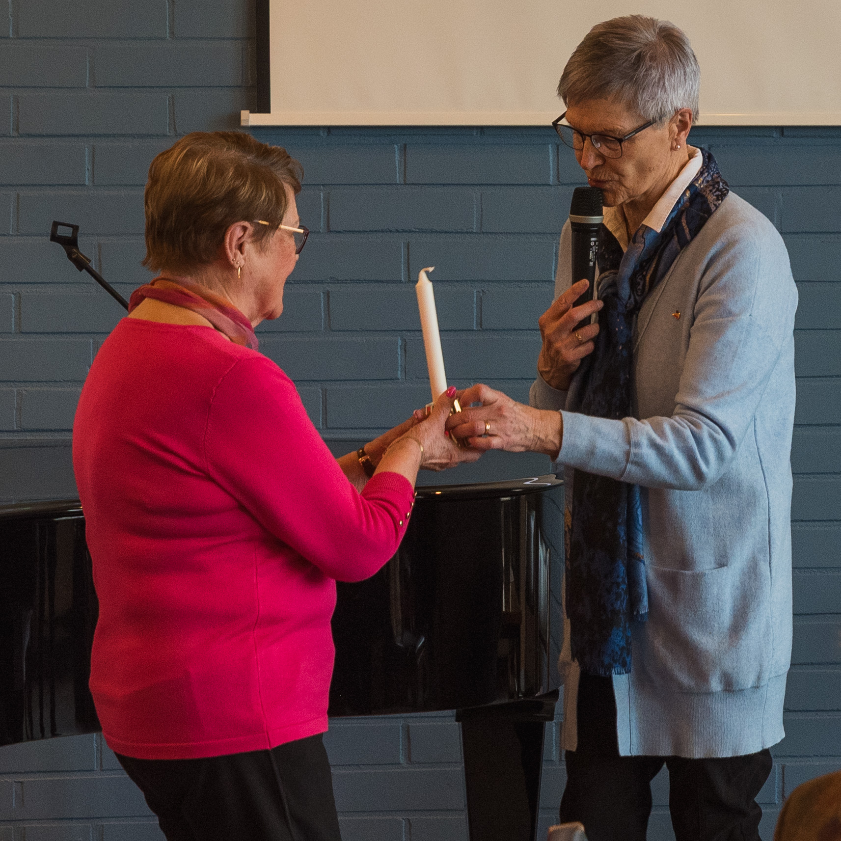 Leena Maunu avtackades för sin mångåriga medverkan i styrelsen med Aalto-ljusstake och en bukett med blommor